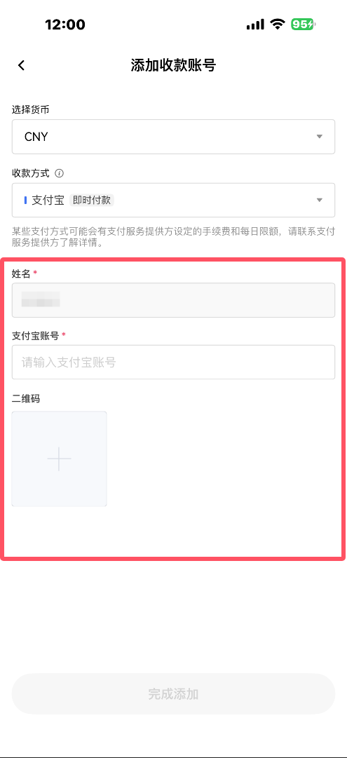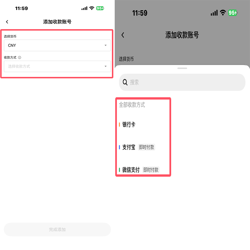 3.添加收款账号可以重新选择货币和收款方式,点击如图