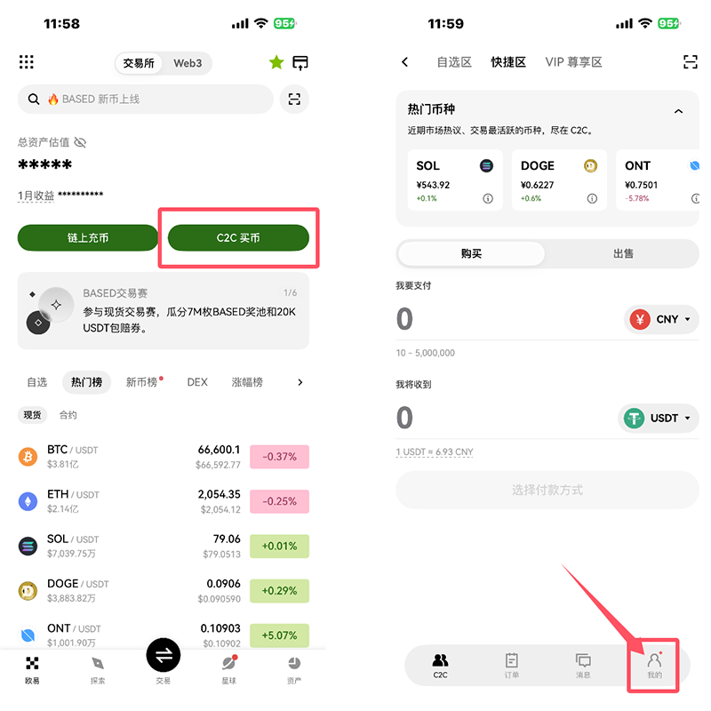 - 买币:在APP首页点击“买币”,选择“快捷交易”或“C2C交易”。
