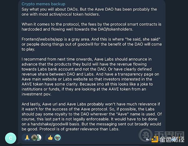 尽管DAO模式备受争议,但Aave DAO的代币持有者是最活跃和发声的群体,这显示了其社区活力。前端、网站和应用是争议焦点,这里容易出现“各执一词”的情况,缺乏清晰界定。