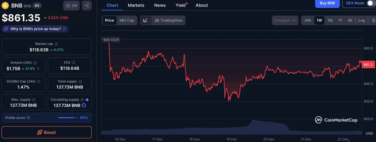 过去七天,BNB 经历了略高于 3% 的可控回调,在未能守住 890-900 美元阻力位后,目前仍处于整体盘整结构中。图表显示,本周中期价格曾大幅下跌至 820-830 美元支撑区域附近,随后稳步反弹,表明此次回调是由流动性驱动而非结构性疲软所致。