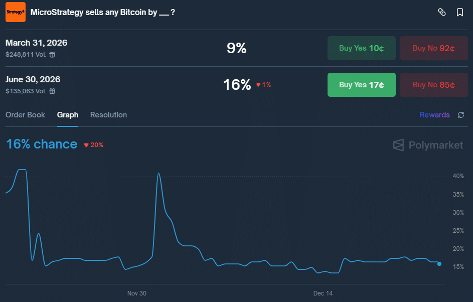 有趣的是,预测网站Polymarket也描绘了类似的景象。机会截至发稿时,Strategy在2026年第一季度被MSCI指数除名的概率仍然高达75%。相反,Strategy在2026年上半年出售比特币的概率为17%,到2026年第一季度则低于10%。