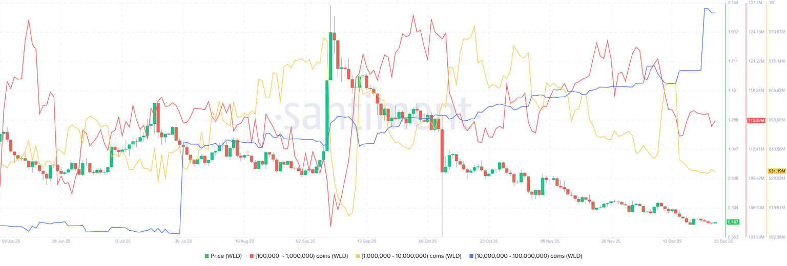 此外,Santiment 的供应分销数据显示,一些大户正在趁着 WLD 价格下跌时买入股票。