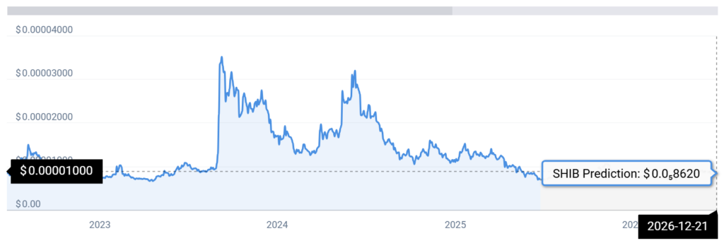 “根据我们对柴犬价格的预测.预计明年SHIB的交易价格将在0.0₅7078美元至0.0₅7236美元之间波动。如果SHIB在2026年达到更高的价格目标,则其价格将上涨1.17%,达到0.0₅7236美元。