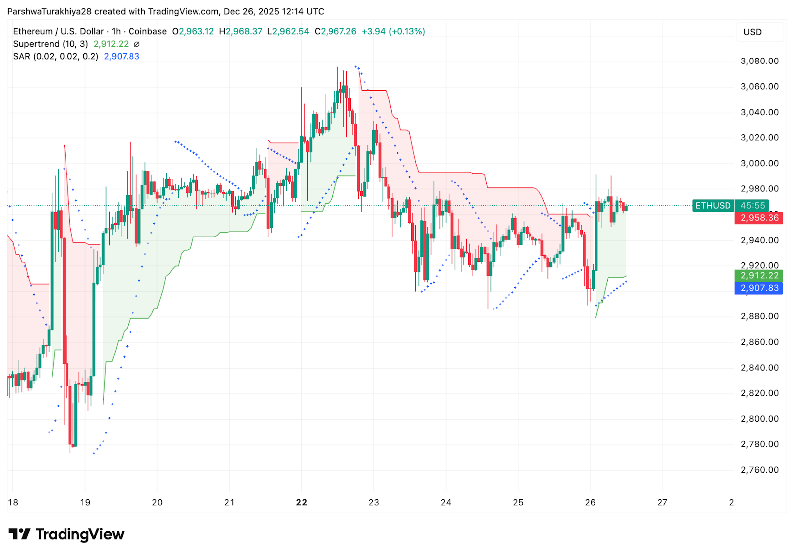 以太坊价格今日在从近期低点小幅反弹后,交投于 2970 美元附近,但其整体结构仍面临压力。价格持续低于下降趋势线和强劲的均线阻力位,令买家持观望态度。12 月 27 日前的市场焦点在于,以太坊能否在关键支撑位上方企稳,还是会重拾回调走势。