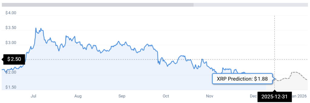 根据 CoinCodex XRP 统计数据到 2025 年 12 月 31 日,该代币价格可能保持在 1.88 美元的中性水平。