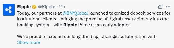 他们也正在进入银行系统。Ripple的合作伙伴纽约梅隆银行已推出代币化存款服务,Ripple Prime 是早期用户之一。