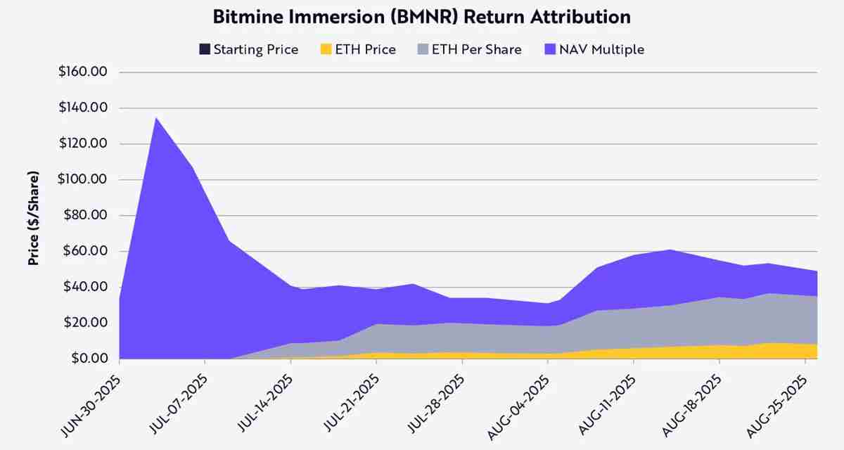 通过沙普利值分解法,可将 Bitmine(股票代码 BMNR)的股价表现归因于三个变量:ETH 价格、每股 ETH 持有量增长、mNAV 溢价或折价变动(见下图)。截至 8 月 25 日,每股 ETH 持有量是推动 BMNR 股价及股东回报的最大因素。