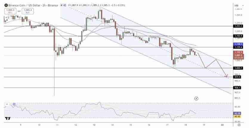 从技术走势来看,BNB目前仍运行于一个宽幅下降通道之中,但买方力量持续在1100至1120美元区间构筑防线。