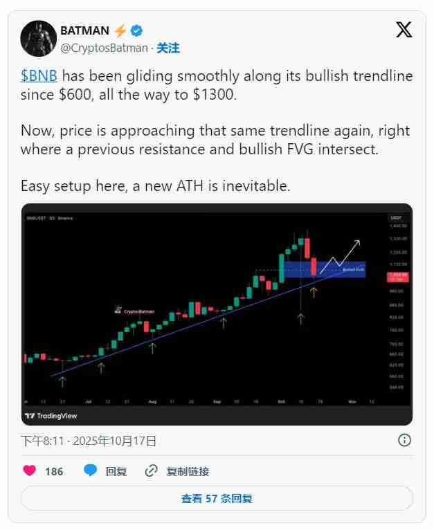 知名分析师BATMAN也指出,BNB的长期上升趋势线自600美元启动以来仍未被破坏,只要价格能稳定站稳1100美元上方,整体多头格局仍有望延续。