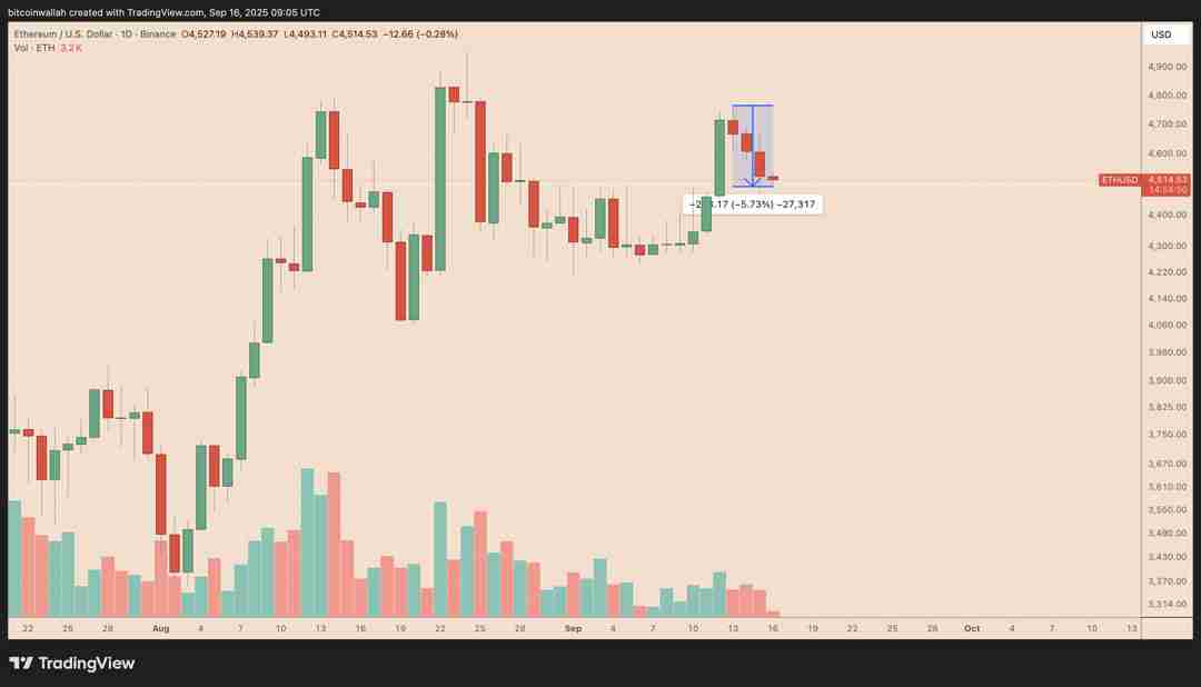 以太坊的原生代币以太坊(ETH)自周末接近4,766美元的高点下跌5.73%,因交易者在周三美联储利率决议前降低风险敞口。
