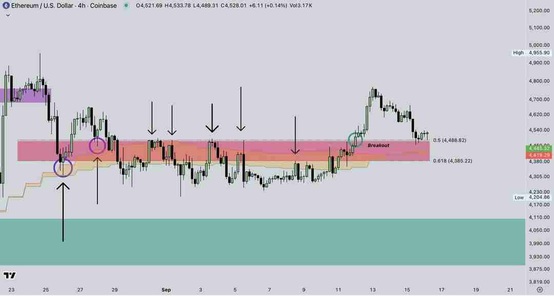 若未能守住20日EMA,价格可能进一步下探至三角形下轨(约4,350美元)和50日EMA(红色线)附近的4,200美元区域。