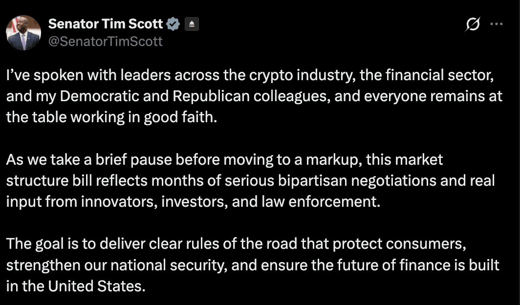 斯科特表示,立法者、行业参与者和监管机构仍在进行真诚的讨论,并将此次暂停描述为正在进行的两党合作进程的一部分。