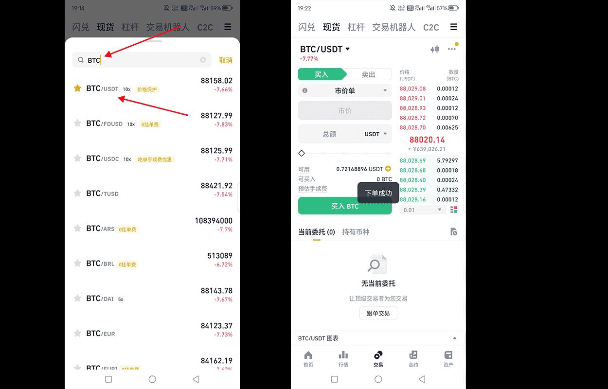 购买虚拟币:在交易页面,点击"现货",并在左上角交易对那里搜索BTC,选择BTC/USDT的交易对。如果你想设置目标买入价和更低的手续费可以使用限价单模式购买。如果想立即购买,可以使用市价单模式(不过手续费会略高),市价单只需要输入购买的金额,点击下单,平台会根据当前最优的价格立即买入成交。