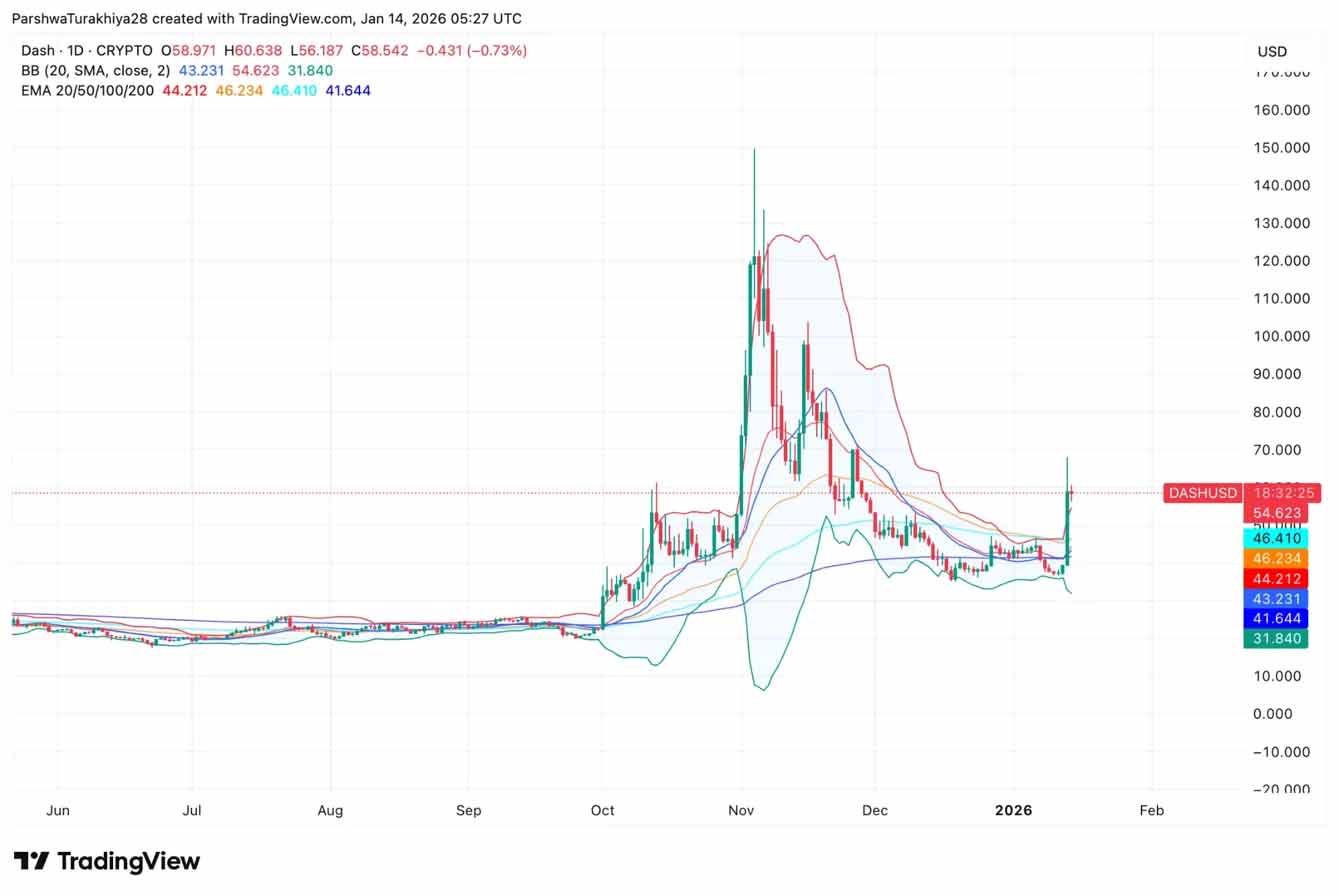 DASH 价格在 58.54 美元附近盘整,此前该股在 11 月份曾飙升至 152 美元,随后暴跌 62%。目前价格在 43 美元至 70 美元区间波动。44.21 美元、46.23 美元、46.41 美元和 41.64 美元的均线显示出价格聚集。43.23 美元至 54.62 美元的布尔带则表明价格处于收缩状态。