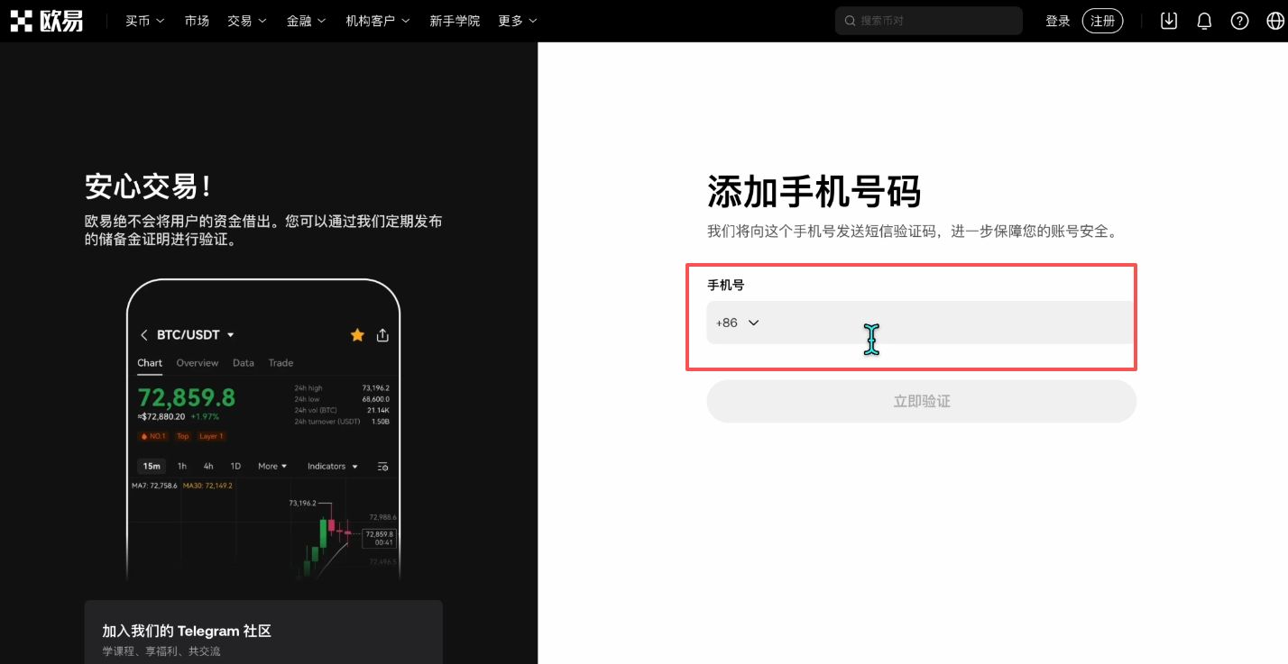 这时候需要绑定一下我们的手机号码,可以看到它是支持中国大陆的手机号码进行绑定的,它是涵盖了中国 86的区号的。因为现在的交易所进行所有的买卖的时候都需要实名制,所以有的交易所就要求我们去绑定手机号,才能够执行入金和出金的操作,所以手机号这个环节是我们必须去绑定的。