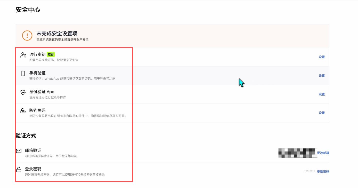 在这里我们可以看到它有很多种的验证方式,这些验证方式都可以一定程度的保证我们的资产安全。因为我们是用邮箱注册的,所以它已经自动绑定好了。包括手机验证这里我们已经在注册的时候绑定好了。接下来就需要我们去进行一下通行密钥、身份验证器APP以及防钓鱼码、紧急联系人等等,我们都可以去把它添加上,以此最大程度上保护我们的账户安全。
