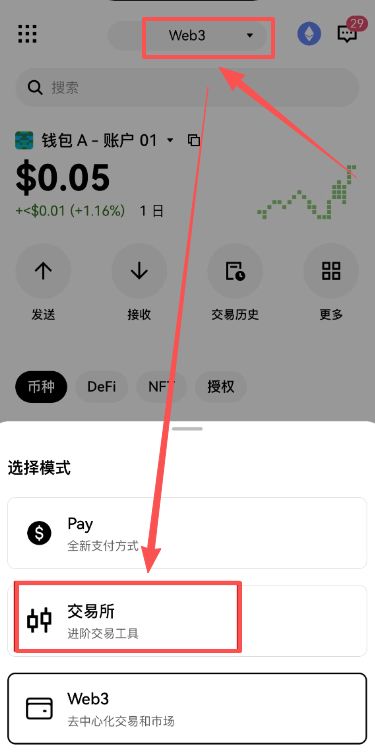 如果进来之后它默认是钱包的页面,我们可以直接在上方中间的部分Web3这里点击,切换到“交易所”的模式。这样我们就可以进入到交易所里面了。