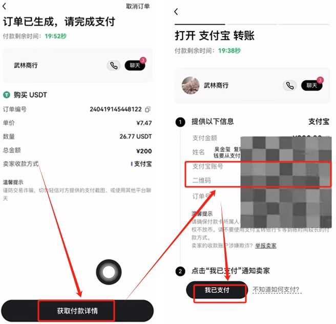 点击下方的【获取付款详情】,根据商家提供的支付方式给他转钱,你可以根据他的支付宝账号或者是他提供的二维码给他付款。付完款之后,点击【我已支付】,等待卖家核实收到钱之后,放币给我们就可以了。