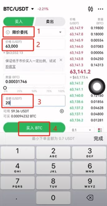 限价委托就是我们来报另一个价,必须得跟这个价格差不多的时候才能够成交。比如现在价格是64500,我们想以64000的价格来进行购买。就输入64000,输入要购买的数量或者是金额,点击【买入BTC】。