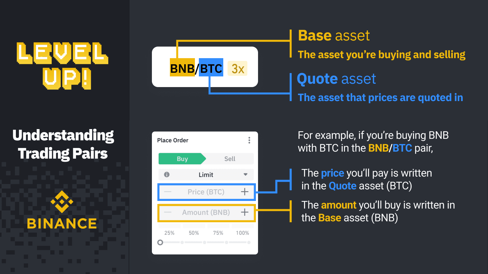 以 BNB/BTC 交易对为例,BNB 为基础资产,而 BTC 为报价资产。