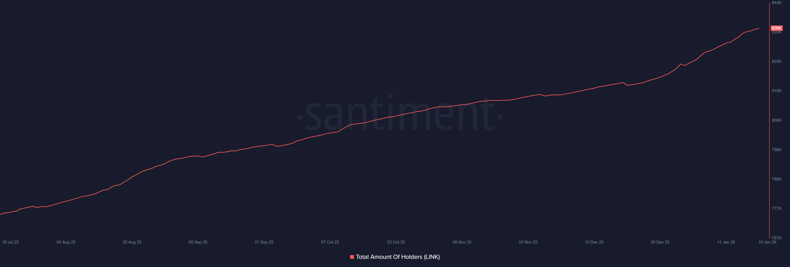 链上指标提供了更多线索。LINK 代币持有者数量在过去几周持续增长,表明尽管参与者群体可能正在缩小,但整体参与度依然保持稳定。
