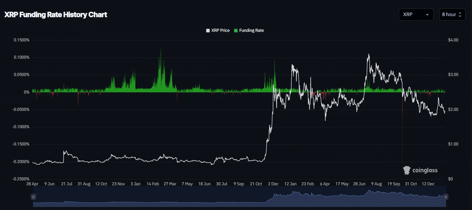 根据 CoinGlass 的数据数据XRP 融资利率和价格在市场周期中表现出密切相关的走势。