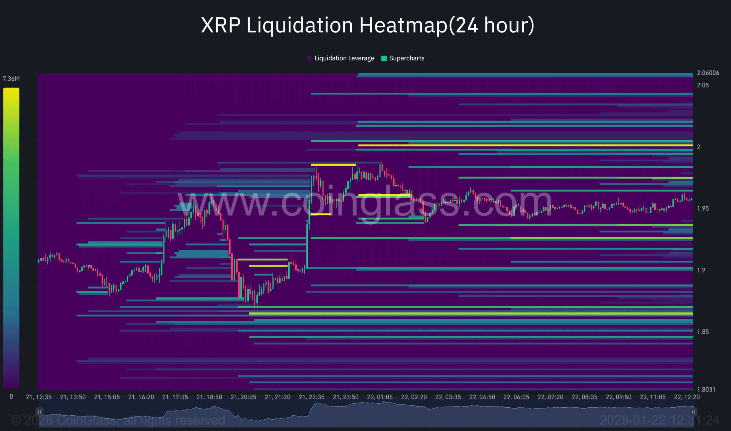 - 负资金和集中清算集群在 2.00 美元以上表明空头挤压风险上升,因为 XRP 维持在 1.95 美元附近,下行流动性有限。