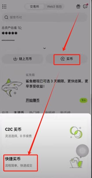 2、进入买币页面,会有自选区与快捷区两个选项。
