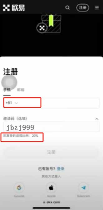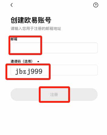 2.输入邮箱号,填写邀请码:jbzj999,可以终身享有20%的手续费优惠。点击“注册”。