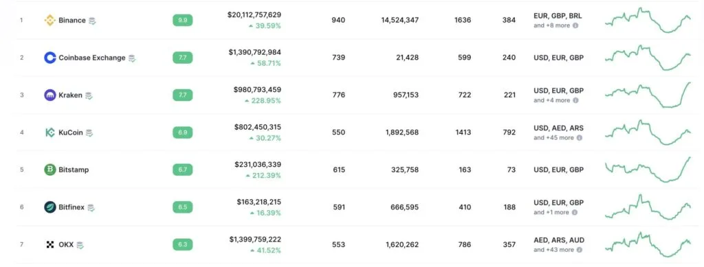 根据 CoinMarketCap 的数据,该交易所自成立以来一直是加密货币交易领域的领导者,目前按交易量计算,币安 在全球最大的加密货币交易所中一直保持在前十名的地位。