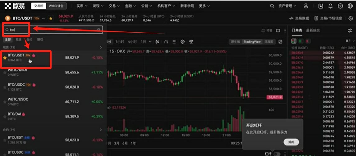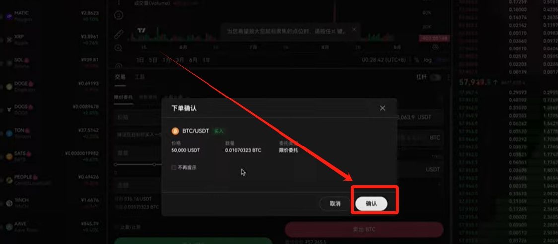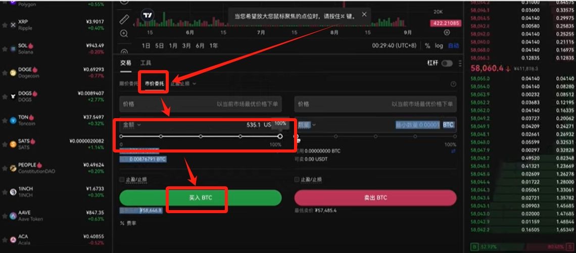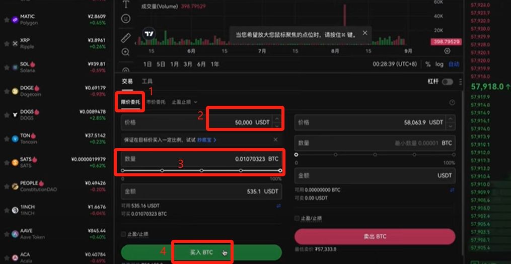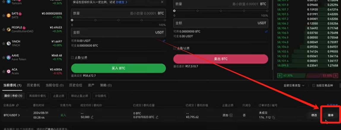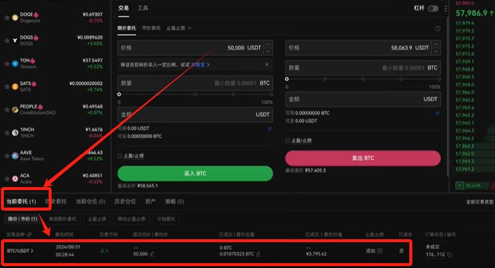 我们想要购买比特币,可以来到交易的部分。购买加密货币主要有两种常用的方式,一个是限价委托,一个是市价委托,我们先来讲一下限价委托。限价单就是以限定的价格去买币,比如说现在比特币的价格是58000左右,而我希望比特币降到5万的时候再去买入,我就把这个价格输入进来,然后输入我们想要购买 多少个比特币,这里我们可以把它拉满。比特币不是一次要买一整个,一整个要30多万人民币,但是我们可以购买0.1个,甚至这边最小可以购买0.00001个。我们根据自己的实际情况 ,拖动这个进度条就可以了。我目前手里的资金,最多是可以购买这么多的比特币的,我们点击【买入BTC】。
