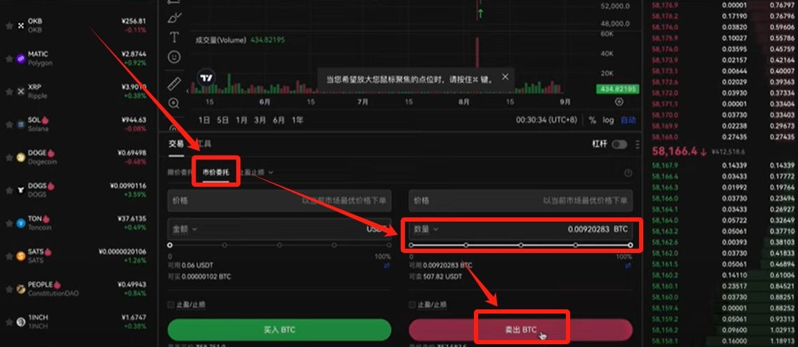 我们可以看到交易的部分,左侧这个绿色的是限价和市价的买入区域。右侧就是限价和市价的卖出区域。如果我们想要卖出虚拟货币,很简单这里我们还是选择限价和市价,我这里还以市价来演示,我们再把比特币卖成USDT。把数量拉满,点击【卖出BTC】。