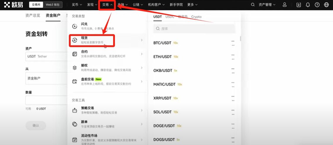 划转好之后,我们点击上方这里的“交易”,找到【现货】交易。
