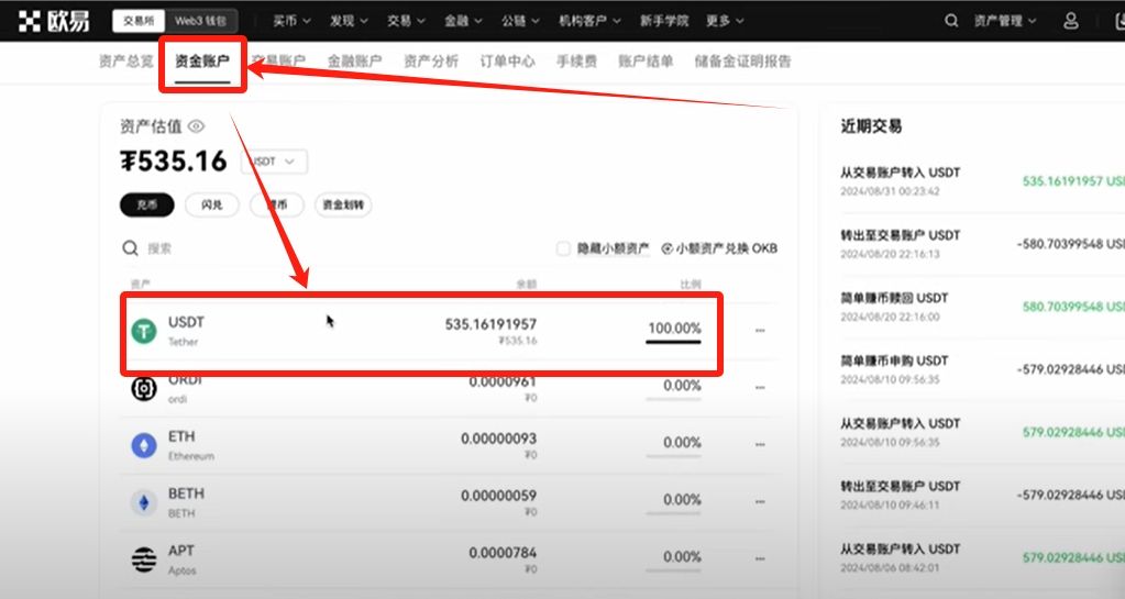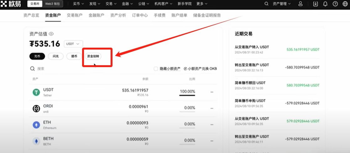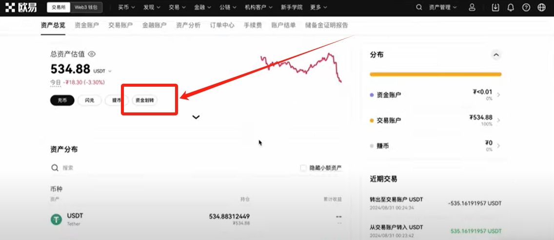 我们想要把U卖出去变现,就需要在资金账户里面操作。所以我们还要把资金划转一下。