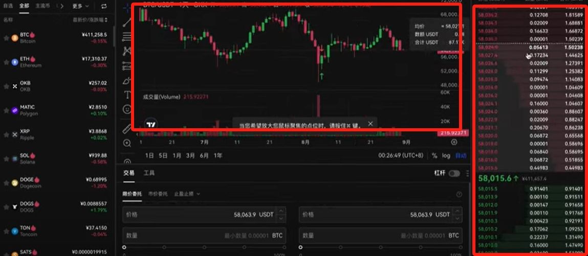 接下来中间这里就是它的K线图,可以选择一个日线看一下,这里我们还可以根据滑动鼠标缩放这个K线。在界面的右侧,红色的是卖单,绿色的是买单,根据市场的情况在实时的变动价格。