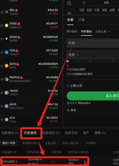 现在我们的比特币就购买成功了。我们来到历史委托看一下,这就是我们刚刚以58086.9的价格购买到的比特币。