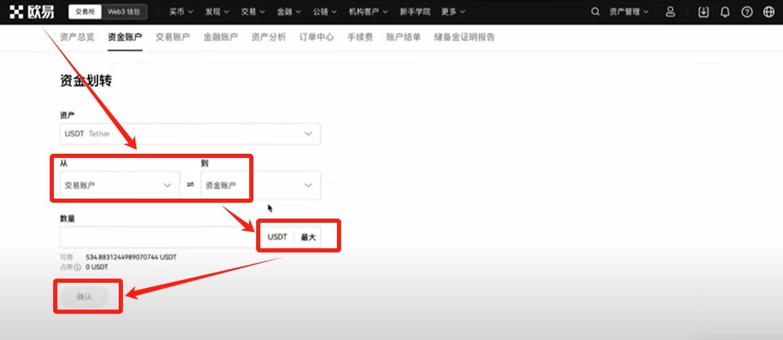 把我们交易账户里面的USDT再划转回资金账户。数量最大,点击【确认】。
