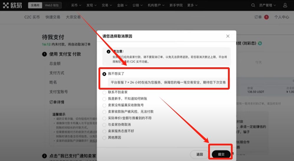 我们付完款,点击我已支付之后,卖家收到提醒就会去线下确认一下,他是否收到了你的转账,没有问题之后,卖家就会把等额的加密货币放行给你。新手小伙伴可能会担心,如果我已经通过第三方平台把钱转给卖家,而卖家不给我USDT怎么办呢?这点大家完全不用担心,因为我刚下这个订单的时候,比如说我们刚刚对应的是138.5个USDT,平台就已经在卖家下单的时候,把卖家账户里面对应的138.5个U给锁定了。如果我们已经把钱付给卖家了,而卖家不把对应的U放行给我们,这个钱也没有在他手里,而是在平台那边压着。平台会核实实际情况,公平的处理的。所以这也是为什么刚才提醒新手家人们,所有跟商家的交流沟通,一定要在币安自己官方的平台里面进行,方便后续客服去核实证据。如果你想取消订单的话,就可以直接点击这里的取消订单。