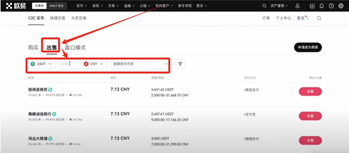 只不过这次我们就要选择【出售】了。这个步骤其实跟我们刚刚入金的时候是一样的。还是在上方这里筛选我们想要卖出的币种,以及卖出的金额和接受的支付方式,然后选择对应的卖家进行交易就可以了。