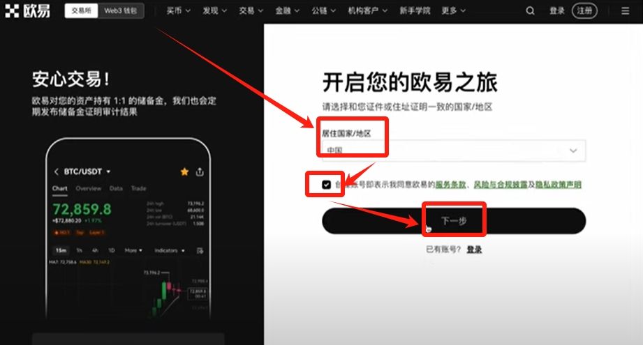 打开链接的时候记得使用梯子。推荐使用中国台湾的IP,不要使用美国、加拿大、新加坡、香港、日本等地的IP进行访问,可能会受到限制。现在我就来到了binance的注册页面,第一步是选择我们的居住国家和地区,要和我们的证件地址保持一致。这里我就选择中国,勾选同意,点击【下一步】。