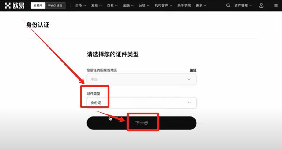 选择我们的证件类型,点击【下一步】。接下来就可是按照他的要求,上传我们的身份证的正反面照片,以及完成最后的人脸识别了。无非就是眨眨眼、张张嘴等操作,大家按照他的提示一步一步的往下走就可以了。完成这些之后,我们就完成了身份认证的环节,是非常简单的,几分钟就可以搞定。