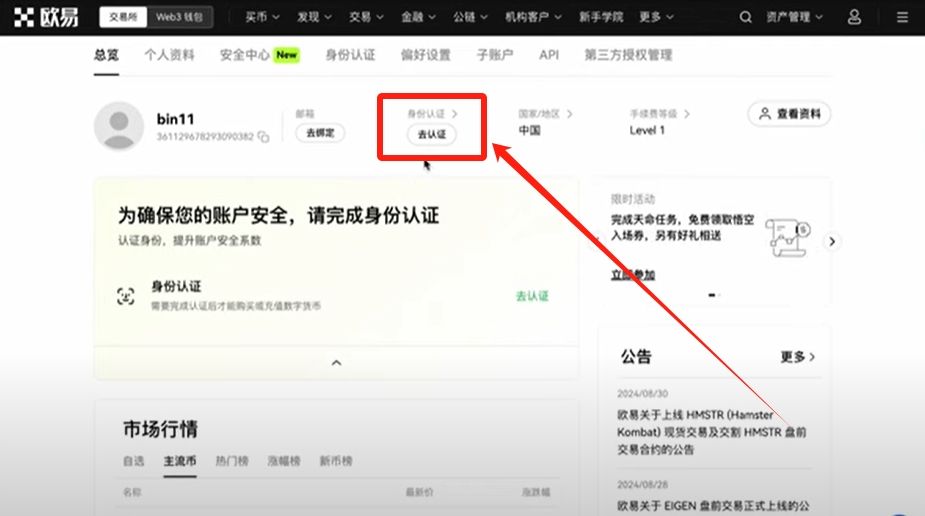 身份认证非常重要,如果我们不认证是没有办法进行后续的买卖操作的,我们点击这里的【去认证】。