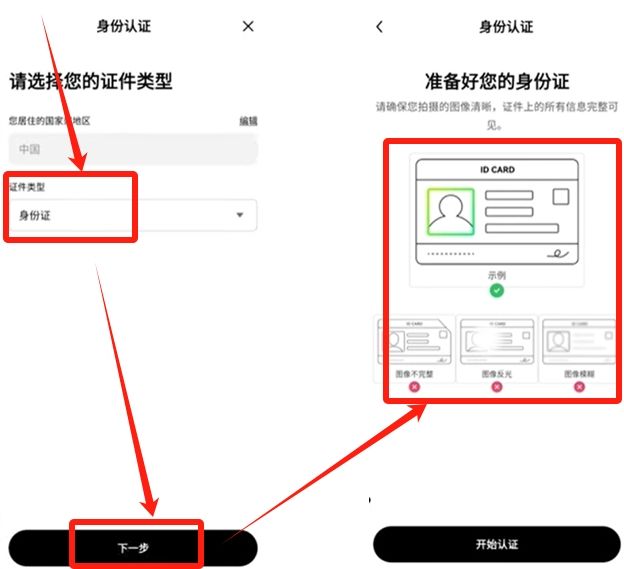 这里面居住的国家和地区是根据我们当时注册的时候选择的国家地区来的。证件类型可以选择提供身份证或者是护照,这里我就选择【身份证】,点击【下一步】。