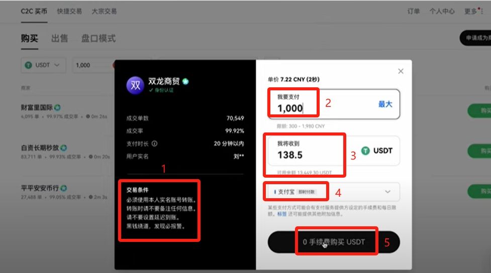 这里我们先不着急输入金额,我们来看一下这里的交易条件。这个卖家他要求必须使用本人实名账号转账,不要备注任何信息,每个卖家他的要求可能是不一样的,所以大家在付款之前,要先看清楚这个卖家的特殊要求。如果确认没有问题的话,我们再输入想要支付的金额,我这里还是输入1000,系统自动换算了我们将会收到138.5个USDT,付款方式是支付宝,确认没有问题之后,点击【0手续费购买】。