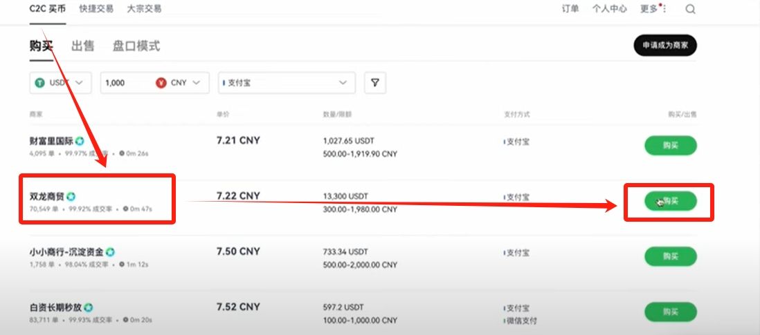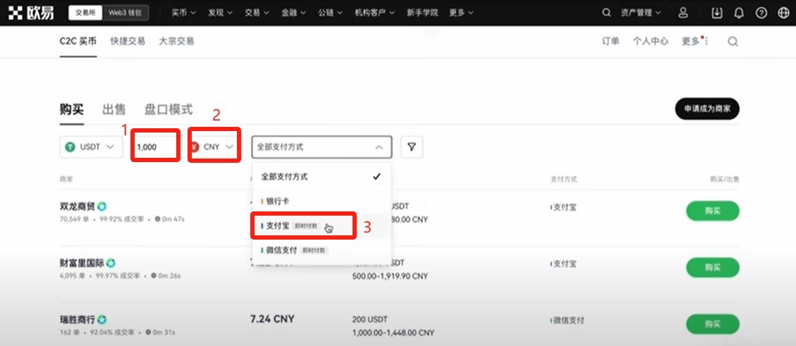 我们在上方的自选框里快速的挑选出我们想要的商家。左边是我们想要购买的币种,比如我这里就想用1000的人民币去购买USDT,这里的CNY就是人民币,你也可以在这里面选择其他的法币。然后选择我们希望的支付方式,银行卡、支付宝或者是微信支付,都很便捷。我这里就选择“支付宝”。