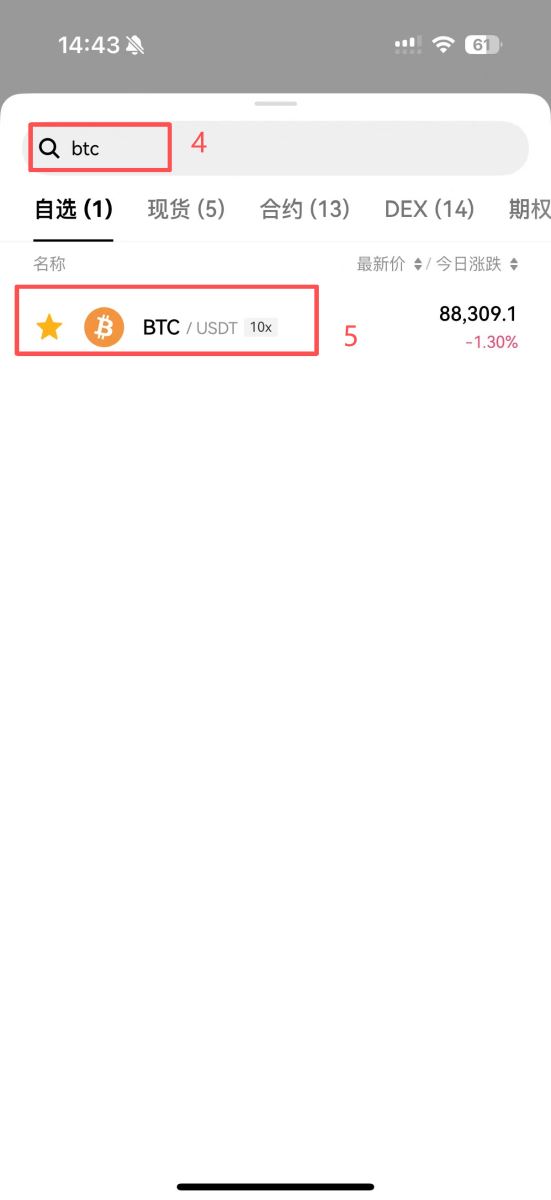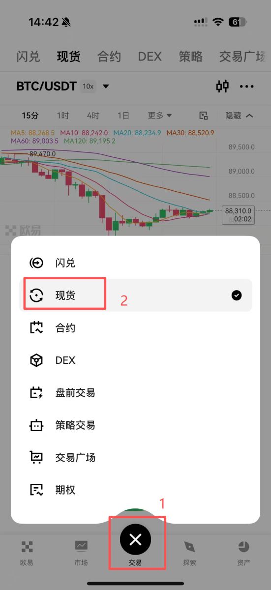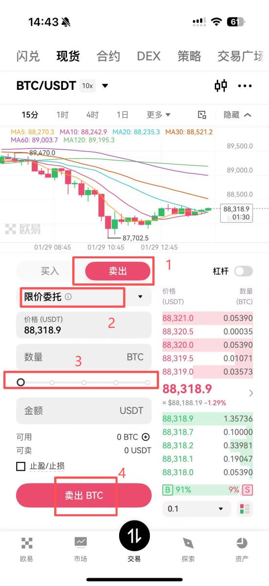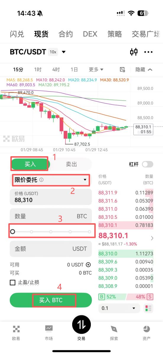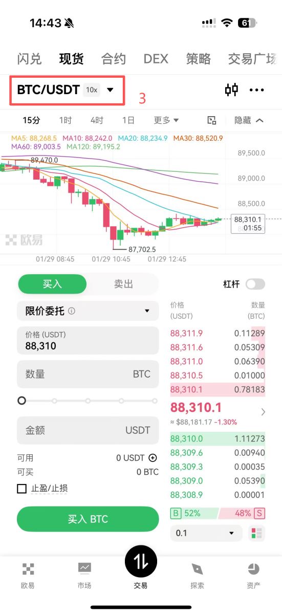 2.现货交易:点击底部导航栏的“交易”,进入现货交易界面。在左上角搜索并选择BTC/USDT交易对。