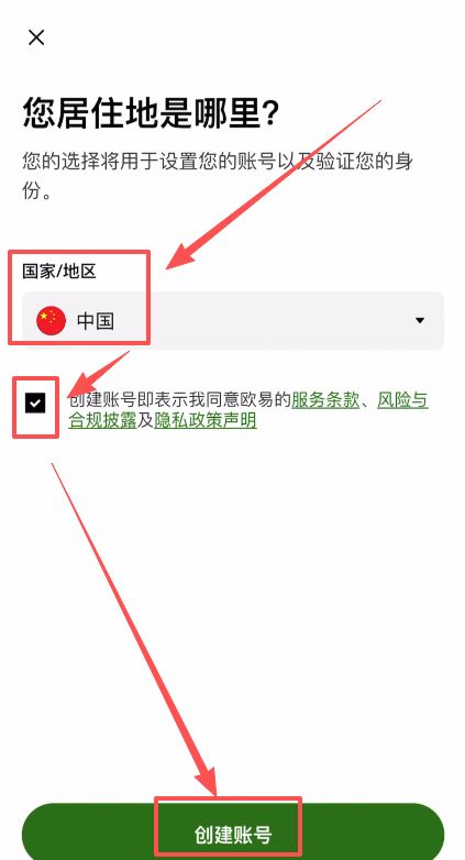 居住地可直接选择“中国”。勾选服务条款,点击“创建账号”。