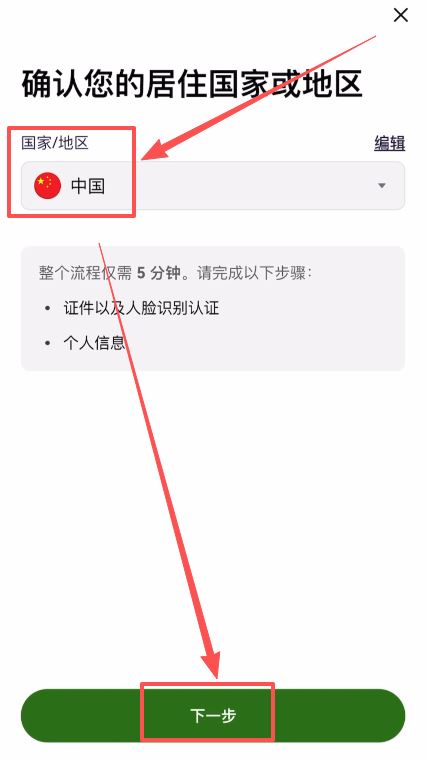 1.确认居住国家/地区:再次选择“中国”。