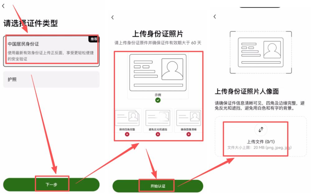 3.上传资料:按照提示拍摄并上传身份证件的正反面照片,并完成人脸识别扫描。