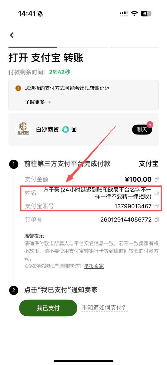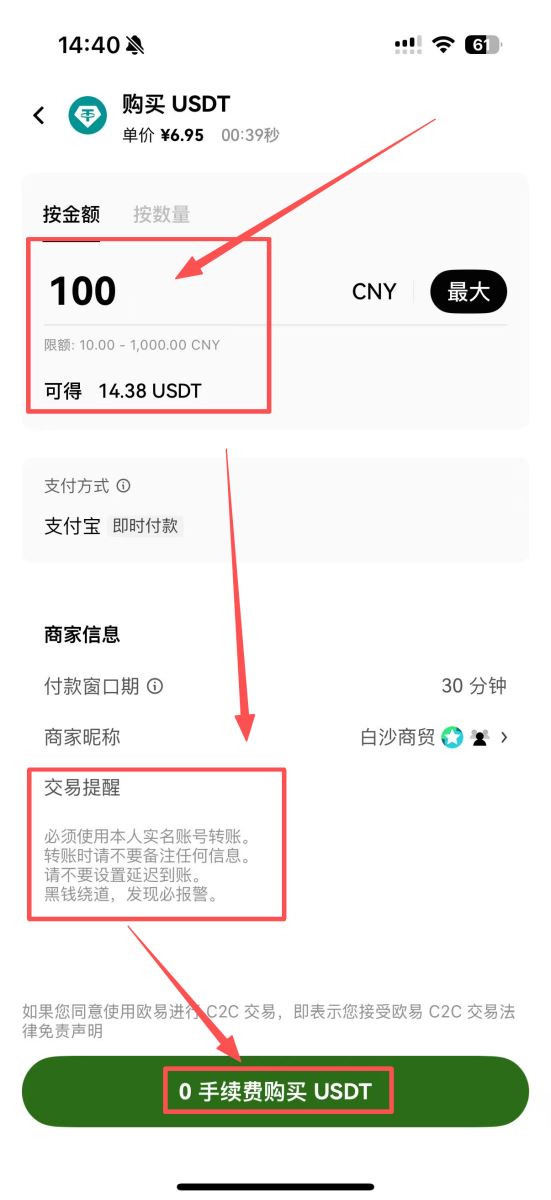 3.下单与付款:确认商家后,点击“购买”并输入金额。请务必仔细阅读商家的交易提醒,严格遵守“使用实名账户付款”、“转账不备注任何信息”等要求。